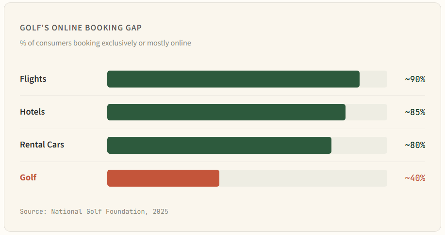 Meanwhile, NGF research shows only about 40% of golfers book tee times mostly online โ compared to 80โ90% for flights, hotels, and rental cars. That's not because golfers are behind. It's because most course websites haven't given them a reason to stop calling.